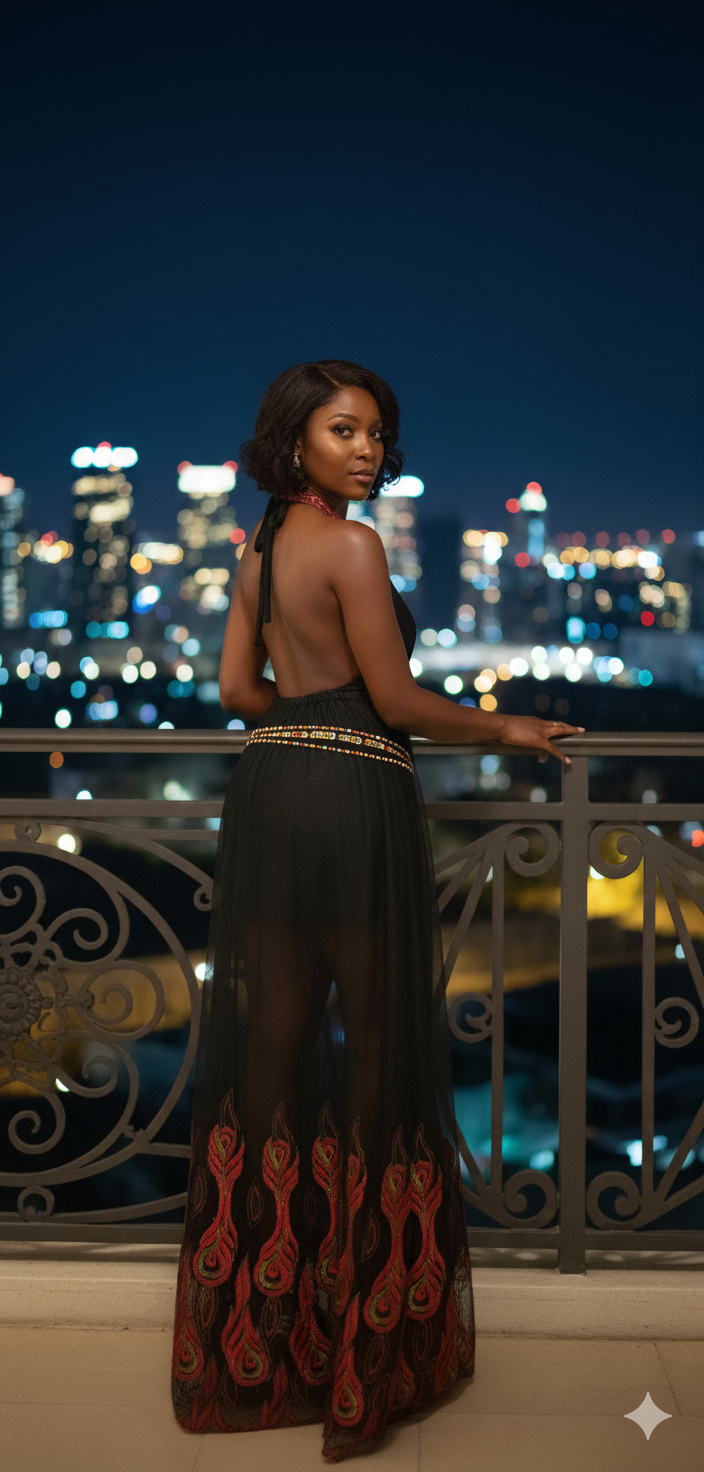 Son décolleté plongeant brodé rouge, ses détails façon “plumes de feu” et son dos entièrement nu en font une pièce magnétique qui sublime la silhouette.
