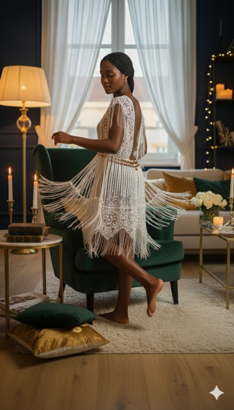 Sa dentelle délicate, son dos nu sensuel et ses franges fluides créent un effet glamour irrésistible à chaque mouvement.